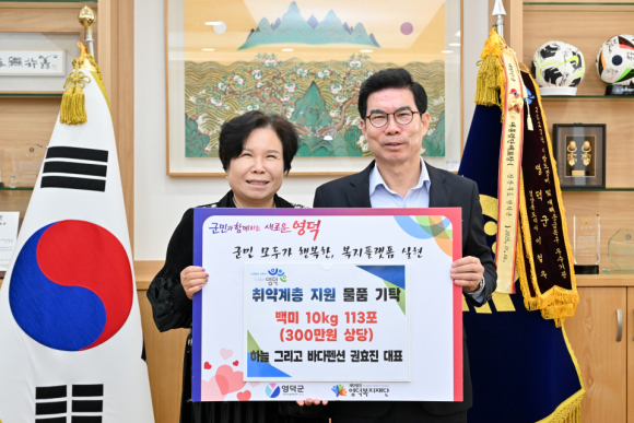 영덕 영해소재 ‘하늘 그리고 바다펜션’ 권효진 대표가 어려운 이웃에게 전달해 달라며 지난 4일 김광열 군수를 만나 300만 원 상당의 백미(10kg) 113포를 기탁했다.