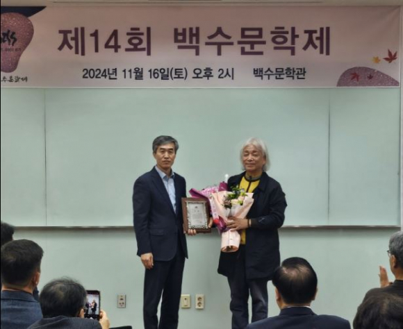 올해 백수문학제 △ 백수문학상은 손동연 시인의 심경(心經), △ 백수문학상 신인상은 이영미 시인의 아버지의 원고지가 선정됐으며, 각각 1,000만 원, 300만 원의 상금과 상패가 수여됐다.
