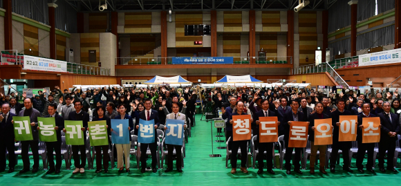 ↑↑ 김하수 청도군수가 청도국민체육센터 실내체육관에서 열린 도시민 및 귀농·귀촌인들을 초청해 제4회 예비귀농귀촌인 초청 페스티벌을 펼치고 있다. 청도군 제공