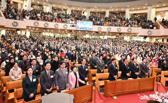 앞줄 왼쪽 두 번째 부터, 조정훈 의원, 권성동 당대표 권한대행 겸 원내대표, 조배숙 의원, 최은석 비서실장, 더불어민주당 이해식 당대표 비서실장, 김민석 최고위원, 이재명 대표, 박찬대 원내대표가 25일 서울 여의도순복음교회에서 성탄예배를 드리고 있다.<순복음교회 제공, 뉴스1> |