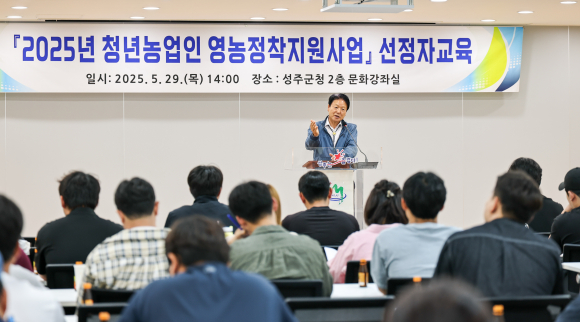 | 이병환 군수가 교육에 앞서 인사말 하고 있다.<성주군 제공> | 성주군은 지난 29일 군청 2층 문화강좌실에서 '2025년 청년농업인 영농정착지원사업 선정자 교육'을 실시했다. 이날 교육은 2025년 5월 사업대상자로 선발된 선정자 47명을 대상으로 청년농업인 영농정착지원사업의 주요내용과 사업추진관련 의무사항에 대해 설명하고, 현장의견을 수렴하기 위해 마련됐다.