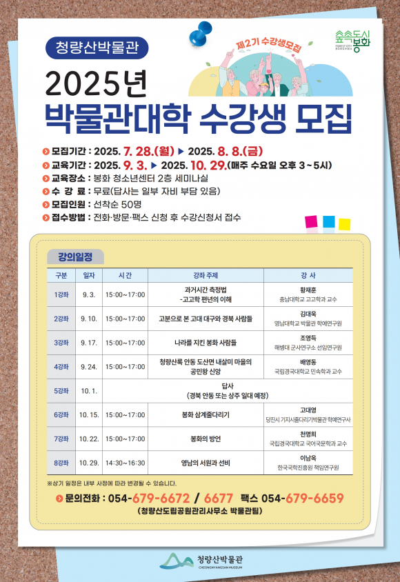 | 모집 안내포스터.<봉화군 제공> | 봉화 청량산박물관이 오는 8월 8일까지 2025년 박물관대학 수강생을 모집한다. 박물관대학은 봉화의 역사·문화를 주제로 한 전문가 초빙 강좌로 9월 3일~10월 29일까지 매주 수요일 오후 3시~5시까지 봉화 청소년센터 2층 세미나실에서 진행된다. 교육은 봉화의 고고·역사·민속 등 광범위한 범위와 다양한 주제를 다루고 있으며, 한 차례의 답사도 마련돼 있다. 봉화군민은 누구나 신청 가능하며 선착순 50명을 우선 모집한다. 수강료는 무료며 다만 답사는 일부 자부담이 있다. 접수 방법은 전화, 박물관 방문, 팩스 신청 후 수강신청서를 접수하면 된다. 박물관 관계자는 “봉화 역사·문화에 대한 전문 연구자의 다양하고 깊이 있는 강좌를 준비했고 답사도 준비되어 있으니, 지역 역사와 문화에 관심 있는 이들은 많은 참여 바란다”고 전했다. 자세한 사항은 청량산도립공원관리사무소 누리집(홈페이지)이나 청량산박물관(054-679-6671~2)으로 문의하면 된다. |