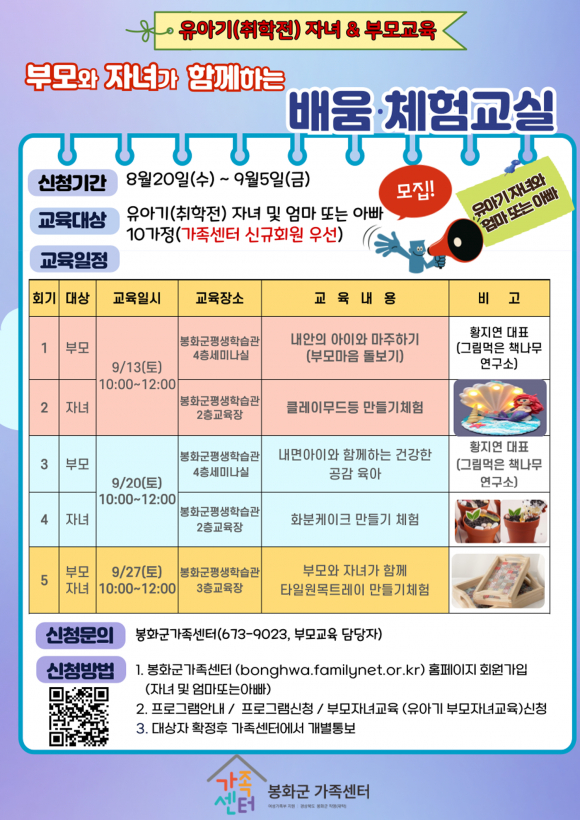 봉화 가족센터가 오는 9월 5일까지 ‘‘2025년 생애주기별 부모와 자녀 역량강화교육’에 참여할 대상자를 모집한다.