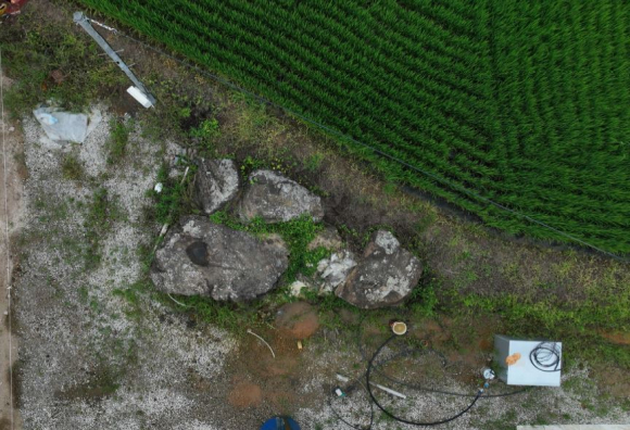 | ↑↑ 이동전 인비리 고인돌 전경(과거 경지정리과정에서 옮겨져 상석 5기가 붙어있음) <포항시 제공> |