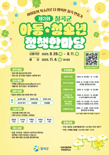 피재호 교육아동복지과장은 “본인이 제안한 정책이 실제 군정에 반영되는 경험을 통해 아동·청소년의 자긍심을 고취시키고 아동? 청소년이 행복하게 살 수 있는 아동친화도시로 자기매김하는 계기가 될 것”이라며“칠곡에 거주하는 아동·청소년의 많은 신청을 바란다”고 전했다.