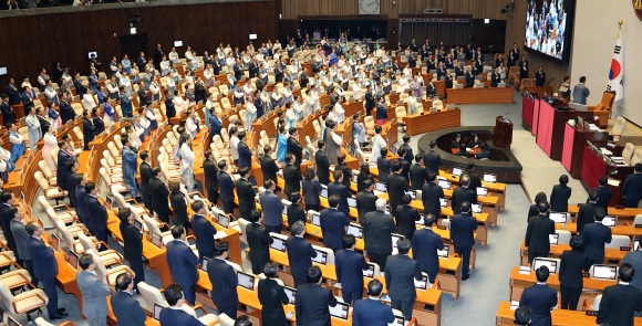 1일 오후 서울 여의도 국회에서 열린 제429회 국회(정기회) 개회식에서 의원들이 국민의례하고 있다. 이날 민주당 의원들은 한복을, 국힘 의원들은 의회민주주의 군조리본과 상복을 입고나와 대조를 이뤘다. 뉴스1
