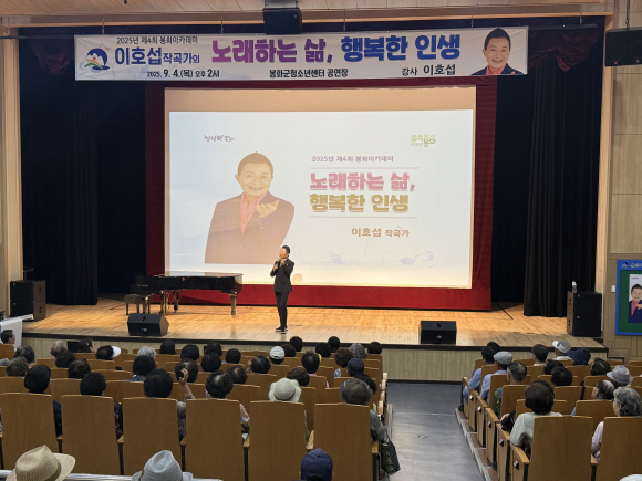 | 이호섭 작곡가 초청 제4회 봉화아카데미 개최 모습.<봉화군 제공> | 봉화군이 지난 4일 청소년센터 공연장에서 군민 300여 명이 참석한 가운데 ‘히트곡 제조기’ 이호섭 작곡가를 초청해 ‘2025년 제4회 봉화아카데미’를 개최했다. 이호섭 작곡가는 ‘10분 내로’, ‘찬찬찬’, ‘다함께 차차차’ 등 세대를 아우르는 히트곡을 다수 작곡한 대중 음악계 거장으로, 현재 창작 활동과 강연, 방송을 통해 대중과 활발히 소통하고 있다. 강연은 ‘노래하는 삶, 행복한 인생’을 주제로 진행됐으며 노래 반주를 곁들여 청중과 함께 노래를 부르며 한층 흥겨운 분위기를 이끌었다. 박현국 군수는 “이번 아카데미가 군민께 음악을 통해 웃고 즐기며 삶의 행복을 되새기는 소중한 시간이 됐기를 바란다”며 “앞으로도 삶에 활력을 더해 줄 해당 분야 전문가를 초청해 수준 높은 강연을 제공하겠다”고 전했다. |