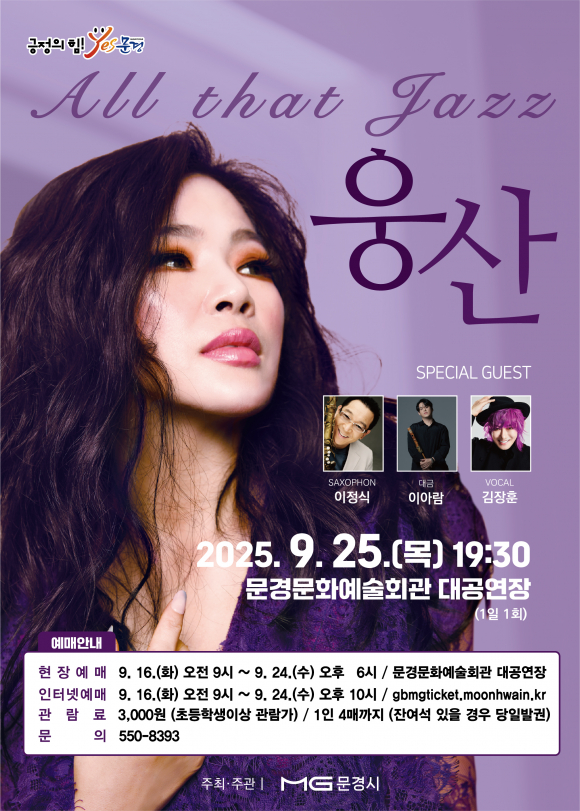 문경시가 오는 25일 오후 7시 30분 (1일 1회)에 문화예술회관 대공연장에서 예술성과 대중성의 완벽한 조화로 대중에게 많은 사랑을 받으며 아시아를 대표하는 재즈보컬리스트 웅산의 All That Jazz를 공연한다.