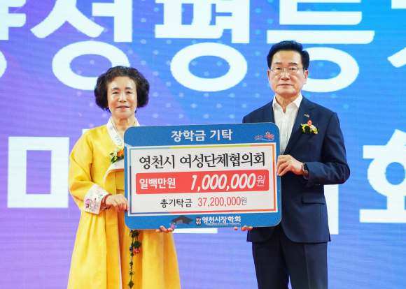 9일 영천체육관에서 열린 ‘2025 양성평등기념식 및 한마음대회’에서 영천 여성단체협의회가 100만 원 장학금을 영천장학회에 전달했다.