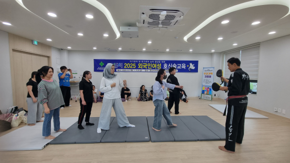 | ↑↑ 경산시가족센터 옥산공동육아나눔터에서 진행된 '2025 외국인 여성 호신술교육'이 열리고 있다. 경산시 제공 |