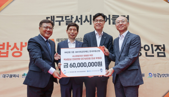 iM금융그룹 iM사회공헌재단이 지난 10일 대구 달서구 소재한 '백세밥상 진이찬방 대구상인점' 개소식에서 시장형 사업단 창업 지원을 통해 안정적인 노후 생활을 지원하고, 일자리 창출 기여를 위한 후원금 전달식을 진행했다.