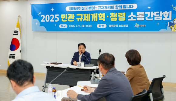 | 소통 간담회 개최모습.<성주군 제공> | 성주군이 지난 11일, 관내 6개 경제 관련 협의회 회장단과 “2025 민-관 규제개혁·청렴 소통간담회”를 개최하여 규제개혁을 위한 현장의 목소리를 들었다.