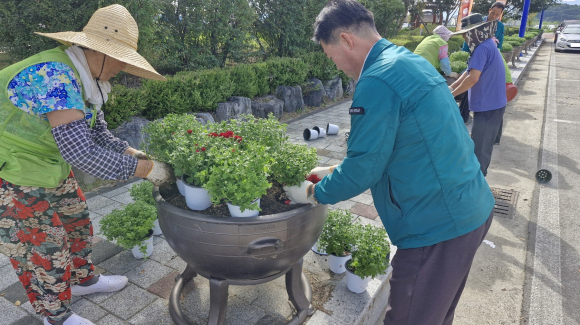 성주 벽진면이 지난 15일 면 소재지 가로 화분에 가을꽃을 식재했다.