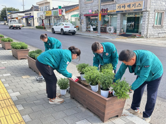 이날 면사무소 직원과 기간제 근로자들이 함께 주요 도로변에 놓인 70여 개의 대형화분에 국화 모종을 식재했다.