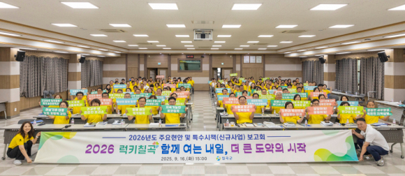 | 칠곡군이 지난 16일, 군청 강당에서 6급 팀장 이상 200여 명이 참석한 가운데 ‘2026년 주요현안 및 특수시책 보고회’를 가졌다.