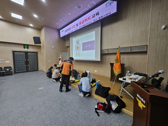 | 심폐소생술 및 응급처치 교육 모습.<봉화군 제공> | 봉화군이 지난 16일 소방서 대회의실에서 자동심장충격기 의무설치기관 관리책임자 등을 대상으로 심폐소생술 등 응급처치 교육을 실시했다. 교육은 봉화소방서 예방안전과 장영익 전문강사가 진행했으며, 교육 내용으로 ▲심정지 환자의 심폐소생술 실시방법 ▲ 자동심장충격기(AED) 사용법 ▲생활 속 각종 사고 시 응급처치 등 이론·실습 교육으로 진행됐다. 특히 자동심장충격기 의무설치기관에 대해 월 1회 이상 정기 점검, 의무설치기관 외 설치기관에도 자동심장충격기(AED) 관리의 중요성을 알리고 철저한 관리가 이루어질 수 있도록 교육했다. 박현국 군수는 “응급처치에서 무엇보다 중요한 것은 초기대응이며, 이번 교육으로 주민 생명과 안전을 위해 노력할 수 있는 기회가 됐으면 한다.”고 말했다. |