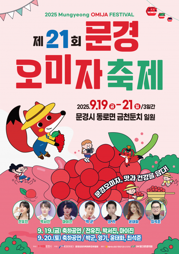 올해로 21회를 맞이하는 문경오미자축제는‘문경오미자, 맛과 건강을 담다!’라는 주제로 19일~21일까지 동로면 금천둔치에서 진행된다. 축제 하이라이트인 개막식은 현역가왕 출신의 박서진, 전유진, 마이진 등 정상급 가수의 축하 공연으로 특별한 밤을 선사하고, 20일에는 문경 홍보대사인 박군, 영기, 주미 등이 분위기를 달굴 예정이다. 폐막식이 열리는 21일에는 문경오미자 노래교실 경진대회를 비롯하여 박미영, 앵두걸스, 장혜진, 한혜정의 축하공연으로 축제 마지막 날 대미를 장식한다.