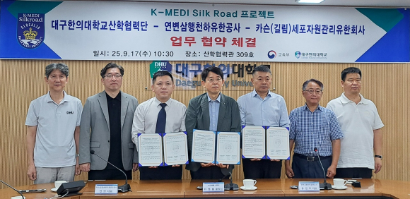 대구한의대(총장 변창훈)가 지난 17일 산학협력관 309호 세미나실에서 연변삼행천하유한공사, 카슨(길림)세포자원관리유한공사와 G벨트 확산 및 K-MEDI 실크로드 성장 촉진을 위한 업무협약(MOU)을 체결했다.