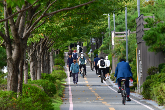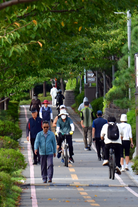 완연한 가을날씨를 보인 23일 포항 남구 철길 숲에서 긴팔 차림 시민이 숲길을 따라 산책하고 있다.뉴스1 |
