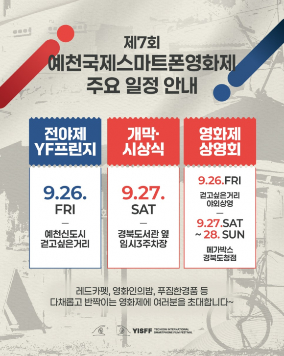 | 국내 유일 국제 스마트폰 영화축제 '제7회 예천국제스마트폰영화제'가 오는 27일 개막식을 가지며, 전야제 및 상영회 등 다채로운 행사가 26일∼28일까지 진행된다.