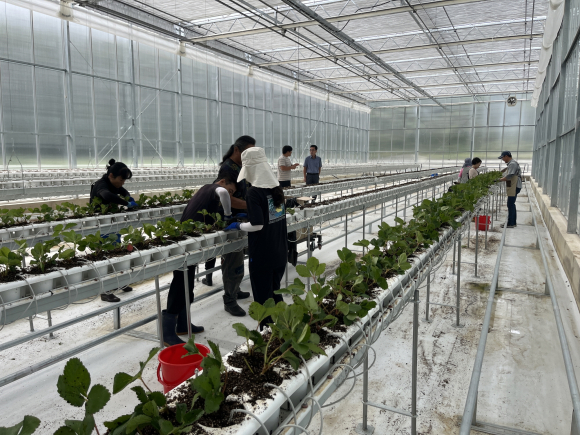 | 스마트농업 테스트베드 교육장 겨울딸기 정식 모습.<봉화군 제공> | 봉화군이 지난 23일 봉성면 금봉리 소재 스마트농업 테스트베드 교육장 온실에 겨울딸기 ‘설향’과 ‘금실’을 정식했다. 정식행사에는 농업기술센터 관계자와 금년 말 창평리에 준공되는 봉화 임대형 스마트팜단지 입주예정인 교육생 등 15명이 참여해 두 품종 딸기 자묘 5,000주를 정식했다. 설향은 2005년 충남농업기술원 논산딸기시험장에서 개발된 품종으로 수확량이 많고 흰가루병에 저항성이 강해 농가에서 선호가 가장 높은 품종으로 국내 재배의 82%를 차지한다. 2016년 경남농업기술원에서 개발된 금실은 설향보다 경도가 높아 저장성이 좋은 품종으로 최근 재배면적이 확대되고 있으며 현재 전국에 7.5%의 농가에서 재배되고 있다. 스마트농업 테스트베드 교육장은 스마트농업 보급 확산을 위해 작물을 실증재배하고 이를 바탕으로 농업인의 기술능력 향상을 위해 교육을 제공하는 곳으로, 군에서는 22억원의 사업비로 복합환경제어시스템이 구축된 2,000㎡ 규모의 ICT 융복합 첨단 스마트 온실 1동을 금년 1월 준공했다. 군 테스트베드 교육장에서는 지난 4월말~7월말까지 임대형 스마트팜 입주 교육생들이 여름딸기 ‘미하’ 품종을 1작기 직접재배해 현장 실습교육과 컨설팅을 받은 바 있다. 신종길 농업기술센터소장은 “스마트농업 테스트베드 교육장에서는 최신 ICT 기술과 온도, 습도, 광량, 양분 공급량 등 데이터를 수집해 임대형 스마트팜 입주 교육생과 공유하고, 이곳을 스마트농업을 준비하는 농업인에게 쉽게 찾을 수 있는 열린 공간으로 만들어 나가겠다”고 말했다. |