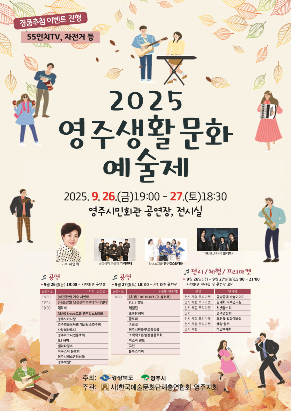 | 생활문화예술제 홍보 포스터.<영주시 제공> | 영주시가 오는 26일~27일까지 시민회관 공연장과 전시실에서 '2025 영주생활문화예술제'를 개최한다. 경북도와 영주시가 공동 추진하고 (사)한국예총 영주지회(회장 김진동)가 주관하는 이번 축제는 지역 생활문화예술 동아리와 시민이 함께 어우러지는 자리다.