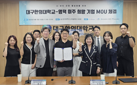 대구한의대(총장 변창훈) 산학협력단이 최근 글로컬대학30 사업과 연계된 K-MEDI 실크로드 프로젝트 일환으로, K-뷰티 산업의 글로벌 경쟁력 강화를 본격 추진하고자 영덕 이주를 희망하는 10개 기업과 업무협약(MOU)을 체결했다.