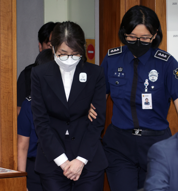 도이치모터스 주가조작과 명태균 공천개입, 통일교 청탁·뇌물 수수 의혹 혐의 등으로 구속 기소 된 김건희 여사가 24일 오후 서울 서초구 서울중앙지방법원에서 열린 첫 재판에 출석하고 있다.뉴스1