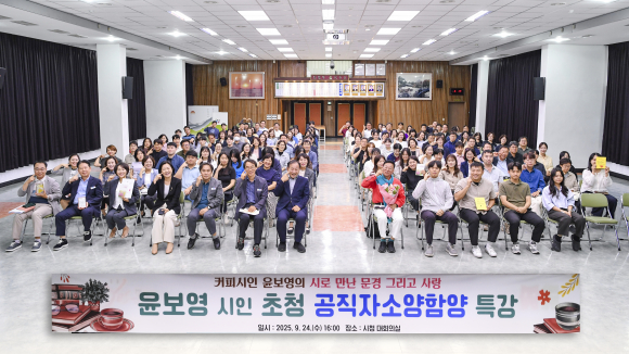 특강은 윤 시인이 고향 문경에서 지닌 시적 감각과 삶의 철학을 바탕으로, 일상 속에서 발견하는 작은 행복과 따뜻한 감성을 전하며 공직자들의 정서적 공감과 자기 성찰의 기회 제공을 위해 마련됐으며, 윤 시인의 대표작인 커피와 사랑을 주제로 한 시들을 소개하며 공직자들에게 위로와 용기를 건넸다.