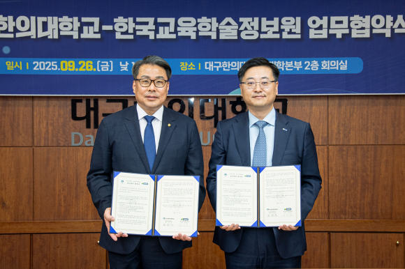 대구한의대가 지난 26일 대학 본부 대회의실에서 한국교육학술정보원(원장 정제영, 이하 KERIS)과 '디지털교육 및 데이터 기반 고등교육 혁신 모델 발굴을 위한 업무협약'을 체결했다.