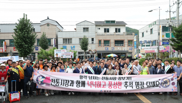 | ↑↑ 김하수 청도군수가 전종율 청도군의장과 군의원 등이 금천면 동곡시장에서 전통시장 장보기 행사와 연계해 ‘일회용품 줄이기’ 친환경 캠페인을 전개하고 있다. 청도군 제공 |