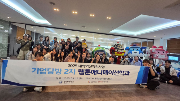 | 웹툰애니메이션학과 재학생들이 현장 탐방 후 기념 사진을 찍고 있.<동양대 제공> | 동양대 웹툰애니메이션학과가 인재 양성을 위해 지난 25일 애니메이션 기업 ‘(주)로이비주얼’ 에 현장 탐방을 진행했다. 탐방은 동양대 취업학생처가 주관해 ‘2025년 대학혁신지원사업 첨단 실무형 역량 전수를 위한 지역 현장 탐방 및 전공 심화 교육 프로그램(기업탐방)으로 ㈜로이비주얼 소개와 ‘애니메이션 산업의 트랜드 및 취업’에 대한 특강과 질의응답으로 진행됐고, 2층에 있는 ㈜로이비주얼 쇼룸을 통해 다양한 굿즈 상품을 구경하기도 했다.