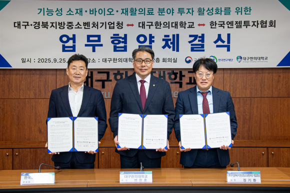 대구한의대이 지난 25일 본관 회의실에서 대구경북지방중소벤처기업청(청장 정기환), 한국엔젤투자협회(부회장 유동준)와 '기능성 소재·바이오·재활의료 분야 투자 활성화를 위한 업무협약'을 체결했다.