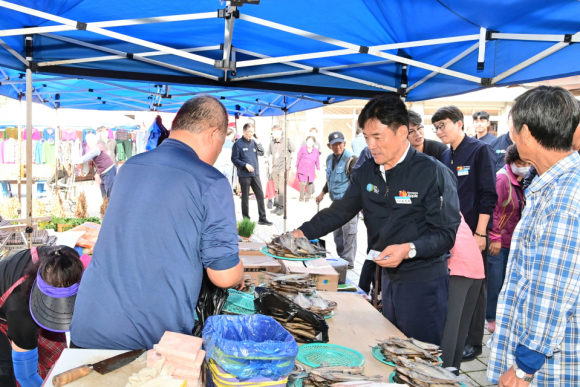 | ↑↑ 군수가 재래시장 장보기를 하고 있다.<청송군 제공> |