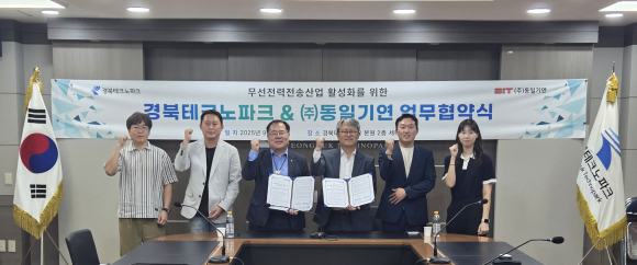 경북테크노파크(이하 경북TP)가 지난 달 30일 세미나실에서 ㈜동일기연과 무선전력전송 산업 활성화를 위한 업무협약(MOU)을 체결했다.