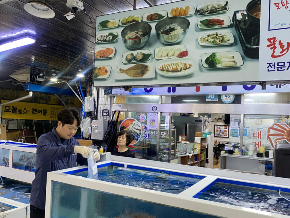 | ↑↑ 포항시 식음료 사전점검반이 수산물, 수족관수, 조리식품 등 유통 식품의 안전관리를 위해 수거·검사에 나섰다.<포항시 제공> |