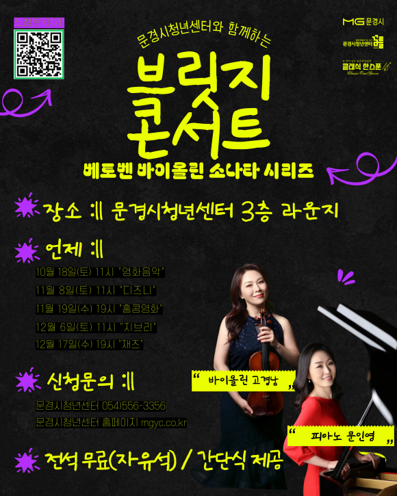 | 청년센터 브릿지콘서트 포스터. | 문경청년센터가 10월~12월까지 문경시청년센터 3층 라운지에서 클래식을 주제로 한 ‘브릿지 콘서트’를 연다.