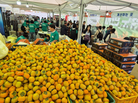 ↑↑ 전국 유일의 씨없는 감 청도반시를 소재로 한 청도반시축제가 열린 가운데 반시를 직접 맛보고 구매할 수 있는 ‘반시마켓’에서 관광객들이 반시를 사려고 북적이고 있다. 황보문옥 기자
