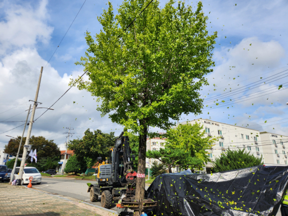 | 의성군이 지난 19일 은행나무에서 떨어지는 열매로 인한 주민 불편을 해소하기 위해 진동 수확기를 활용한 시범 채취 작업을 실시했다.