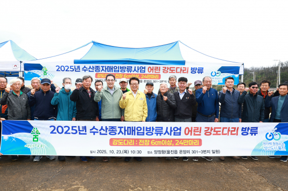 | 울진군이 지난 23일 울진읍 양정항에서 ‘2025년 수산종자매입방류(강도다리) 행사’를 개최하고 강도다리 치어 24만 마리를 방류했다.