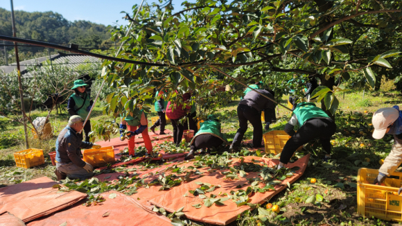 이들은 외남면 소은리 일손부족 곶감 농가에서 감을 수확한 후 감사의 마음을 담아 특산품인 상주 쌀을 전달했다.