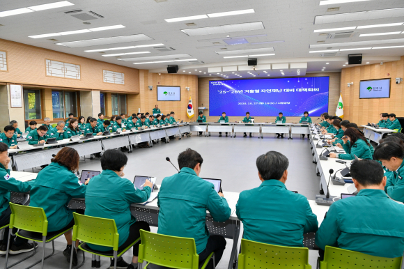 | 겨울철 자연재난 대비 대책회의 모습.<영주시 제공> | 영주시가 지난 27일 시청 강당에서 겨울철 자연재난대비 대책회의를 개최했다.
