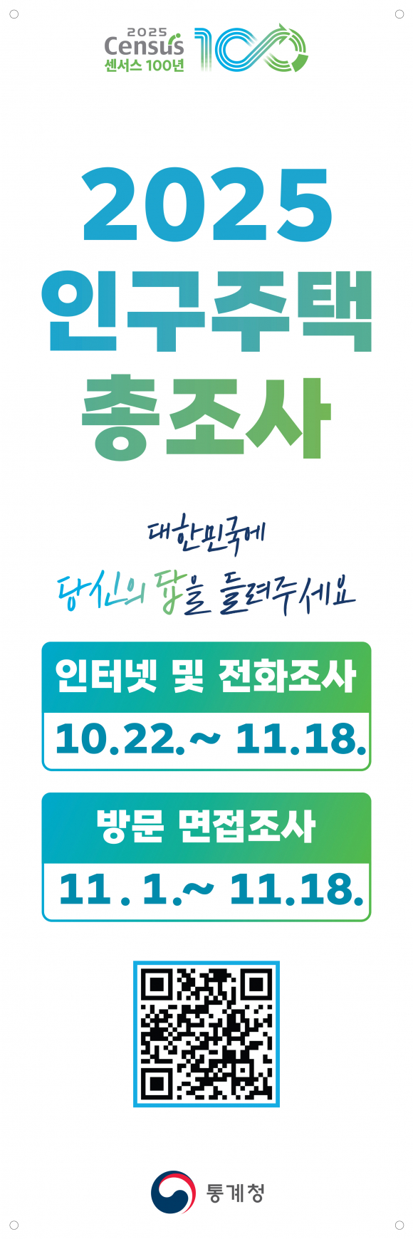 2025 인구주택총조사는 오는 11월 18일까지 인터넷과 전화를 통한 비대면 방식으로 참여할 수 있으며, 10월 말까지 응답하지 않은 가구에 대해서는 11월 1일~18일까지 통계조사원이 방문해 태블릿PC를 활용한 대면조사를 실시한다.