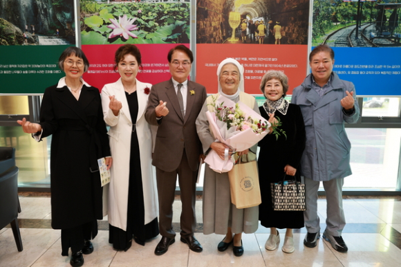 ↑↑ 김하수 청도군수(왼쪽 세번째)가 이해인 수녀 시인과 ‘제21회 여향문학제, 들꽃시축제’에서 참석자들과 기념촬영을 하고 있다. 청도군 제공