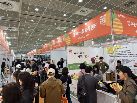 | 푸드위크 코리아에 영주시가 참가해 농특산물을 홍보하고 있다.<영주시 제공> | 영주시가 지난 29일~11월 1일까지 서울 코엑스에서 열린 ‘2025 푸드위크 코리아(제20회 서울국제식품산업전)’에 참가, 지역 농특산물 우수성을 널리 알리고 판로 확대의 발판을 마련했다. ‘푸드위크 코리아’는 농림축산식품부와 코엑스가 주최하고 aT가 주관하는 국내 최대 규모 식품 산업 박람회로, 올해는 42개 국 950개 사가 참가하고 약 6만 5000명이 현장을 찾았다. 행사에는 ㈜한부각, 자연이든(주), 영주농산물유통센터, 소백인삼영농조합법인 등 4개 영주 업체가 참여했다. ㈜한부각은 고추·감자·가지 등 부각류를, 자연이든(주)은 도라지 가공품을, 영주농산물유통센터는 사과를, 소백인삼영농조합법인은 홍삼 가공품을 출품했다. 부스에는 영주시농특산물 시식 행사와 품목별 증정 이벤트가 진행됐다. 특히 사과·부각류·도라지 제품은 현장에서 높은 판매율을 기록하며 수도권 소비자로부터 “품질이 뛰어나 믿을 수 있다”는 긍정적 반응을 얻었다. 강매영 유통지원과장은 “박람회를 통해 영주 농산물이 품질과 신뢰를 인정받는 계기가 됐다”며 “앞으로도 수도권을 중심으로 판촉·홍보 활동을 강화해 지역 농가의 실질적 소득 향상과 지역경제 활성화에 기여하겠다”고 말했다. |