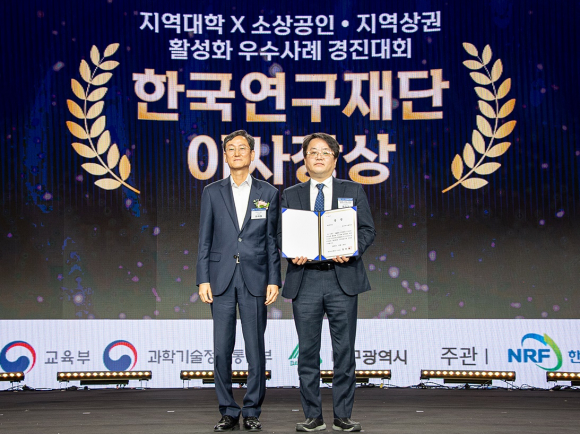 | ↑↑ 대구한의대 RISE사업단 김기근 부단장(오른쪽)이 '2025년 지역대학-소상공인·지역상권 활성화 우수사례 경진대회'에서 한국연구재단 이사장상 수상 후 기념사진을 촬영하고 있다. 대구한의대 제공 |