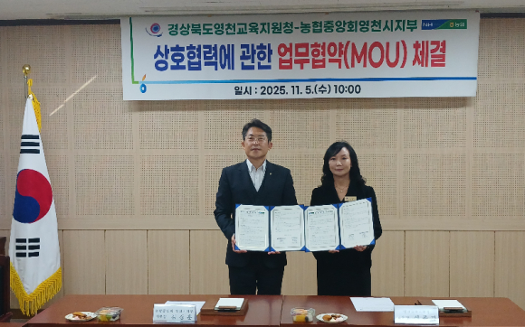 | 영천교육지원청과 농협중앙회영천지부가 5일 농협중앙회 영천지부와 ‘학교 유휴부지를 활용한 스쿨팜 조성'에 관한 업무 협약을 체결했다.