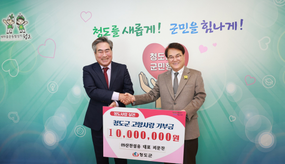 청도군에 지난 5일 대구 소재 ㈜산찬섬유 피문찬 대표이사가 청도를 사랑하는 마음을 담아 고향사랑기부금 1000만 원을 전달했다.