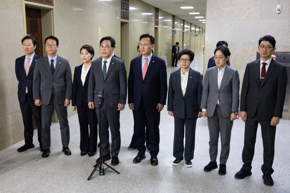 ↑↑ 송언석 국힘 원내대표를 비롯한 야당 운영위원들이 6일 서울 여의도 국회에서 열린 국회운영위 대통령비서실 등에 대한 국정감사 감사중지 후 이기헌 더불어민주당 의원과 충돌 등 운영위원회 상황과 관련해 기자회견을 하고 있다.<뉴스1>