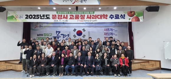 | 문경농업기술센터(소장 김미자)가 지난 11일 농업기술센터 대강당에서 2025년도 문경시 고품질 사과대학 수료식을 열고, 전체 교육 시간 80% 이상을 출석한 교육생 123명 중 87명이 수료 했다.
